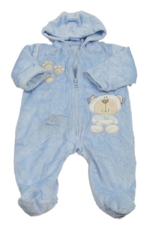 Světlemodrá chlupatá podšitá kombinéza s medvědem a kapucí