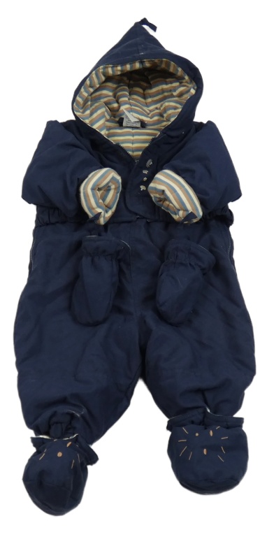 Tmavomodrá šusťáková zimní kombinéza s kapucí + boty + rukavice