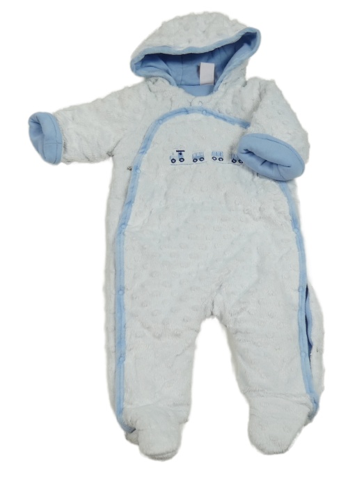 Světlemodrá plyšová minky zateplená kombinéza s vlakem a kapucí Pusblu
