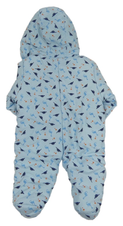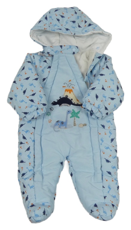 Světlemodrá šusťáková zimní kombinéza s dinosaury a kapucí