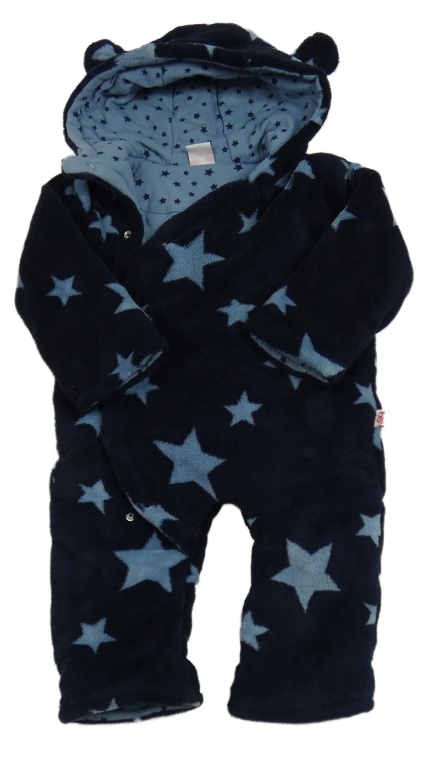 Tmavomodrá plyšová zateplená kombinéza s hvězdami a kapucí