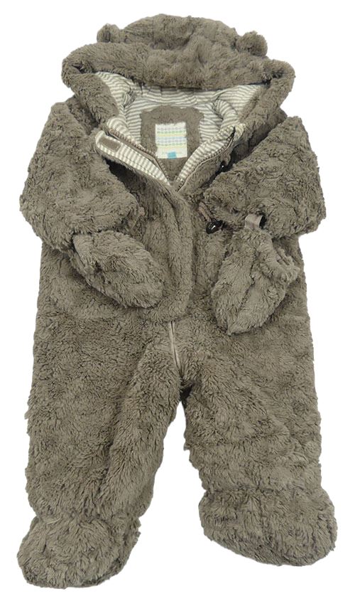 Šedohnědá chlupatá zateplená kombinéza s kapucí + rukavice John Lewis