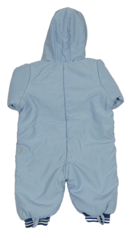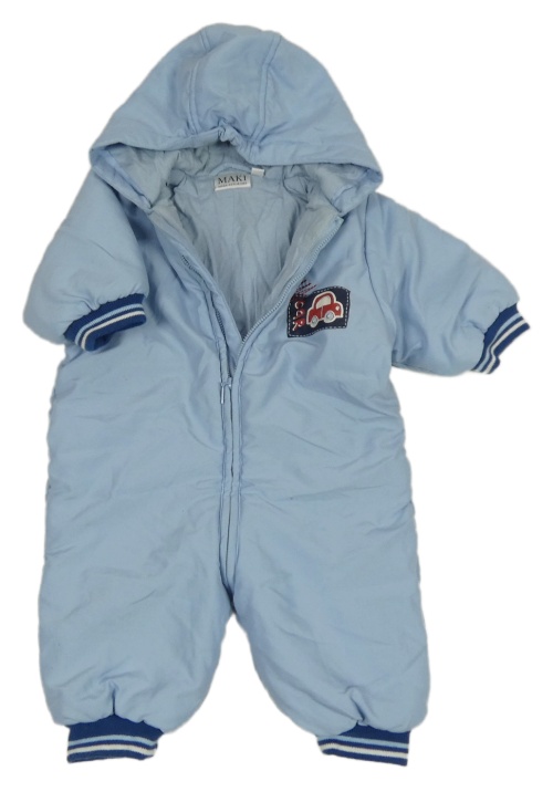 Světlemodrá šusťáková zateplená kombinéza s autem a kapucí