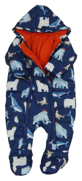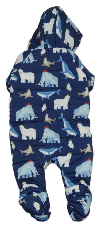 Tmavomodrá šusťáková zateplená kombinéza s arktickými zvířaty a kapucí St. Bernard