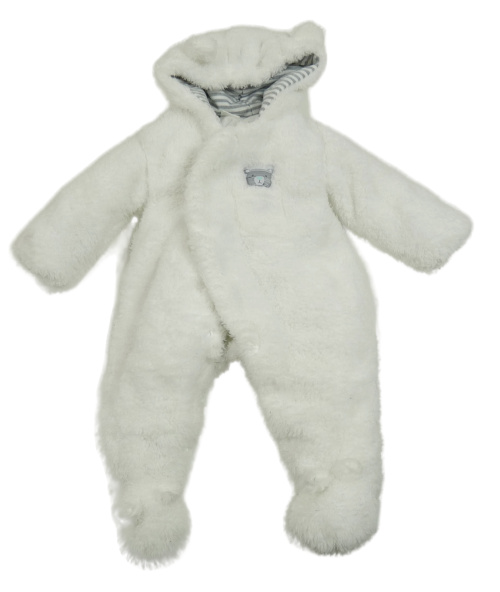 Bílá chlupatá zateplená kombinéza s medvídkem a kapucí