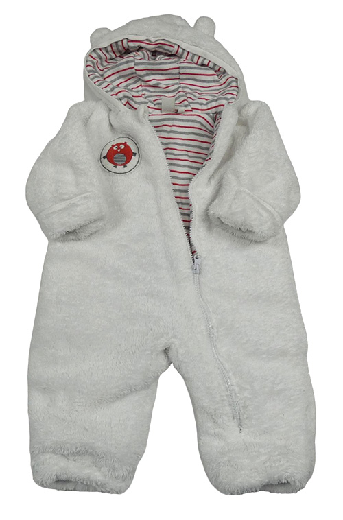Bílá chlupatá zateplená kombinéza se sovou a kapucí