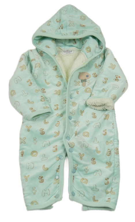 Mátová plyšová zateplená kombinéza s písmeny a kapucí