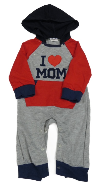 Šedo-červeno-tmavomodrá kombinéza s nápisem a kapucí
