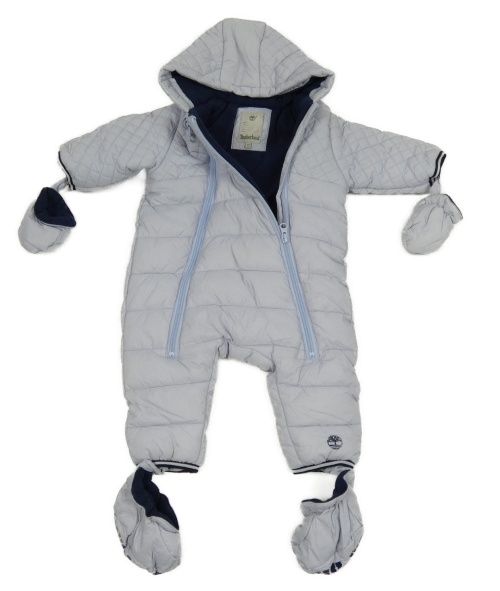 • Světlemodrá prošívaná šusťáková zimní kombinéza s kapucí + rukavice + capáčky Timberland