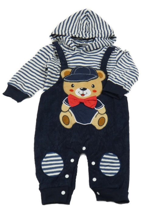 Tmavomodro-pruhovaná manšestrovo/mikinová kombinéza s medvídkem a kapucí