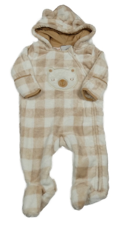 Světlehnědo-bílá kostkovaná chlupatá kombinéza s medvědem a kapucí