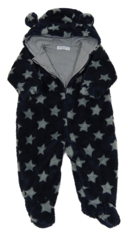 Tmavomodrá chlupatá podšitá kombinéza s hvězdami a kapucí