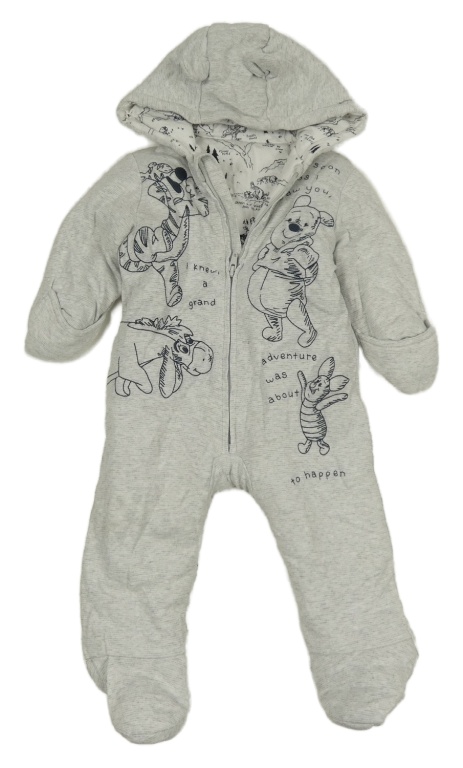Bílo-šedá melírovaná bavlněná zateplená kombinéza s medvídkem Pú a kapucí George