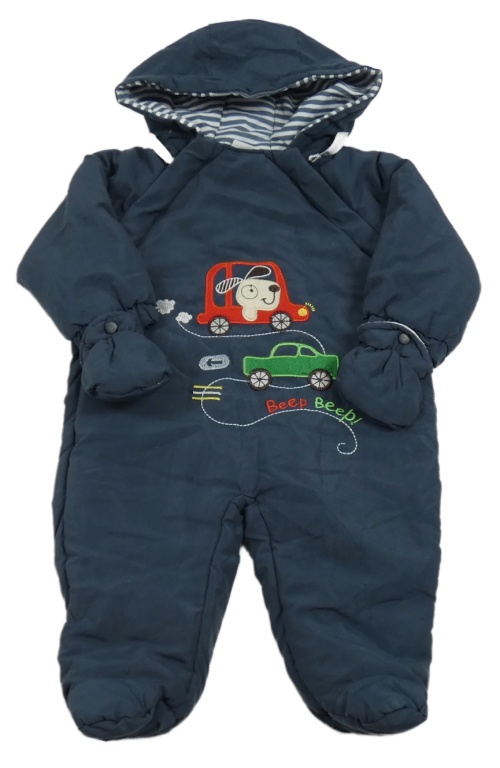 Tmavomodrá šusťáková zimní kombinéza s auty a kapucí