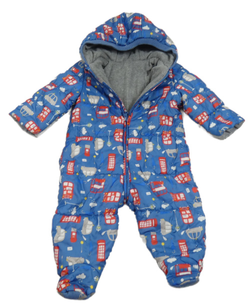 Modrá šusťáková zimní kombinéza s auty a kapucí Mothercare