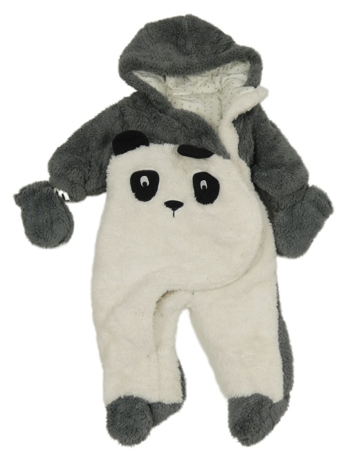 Šedo-bílá chlupatá zateplená kombinéza s pandou a kapucí + rukavice Next