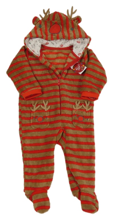Nové - Hnědo-červená pruhovaná plyšová kombinéza se soby a kapucí Matalan