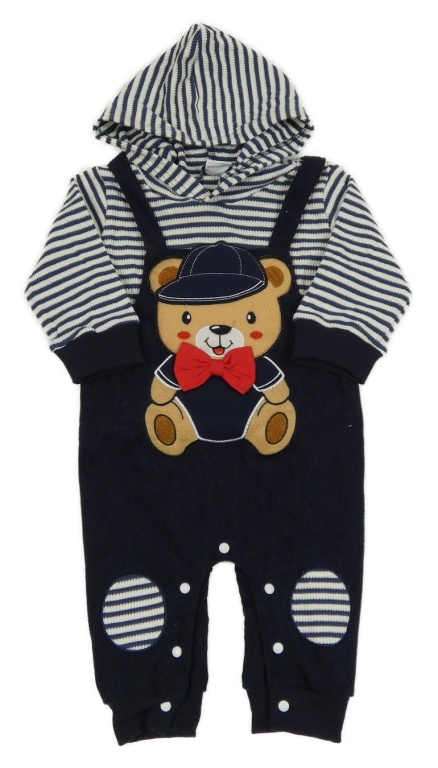Tmavomodro-bílá kombinéza s medvědem a kapucí