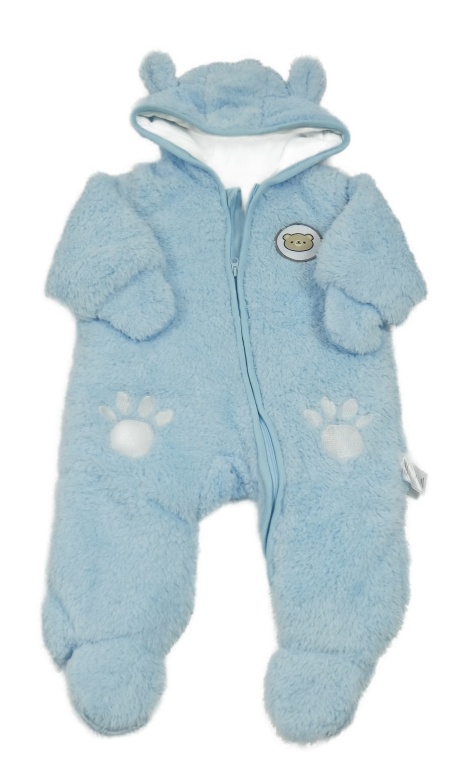 Světlemodrá chlupatá zateplená kombinéza s medvědem a kapucí