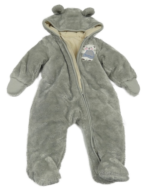 Šedá chlupatá zateplená kombinéza s medvídkem a kapucí