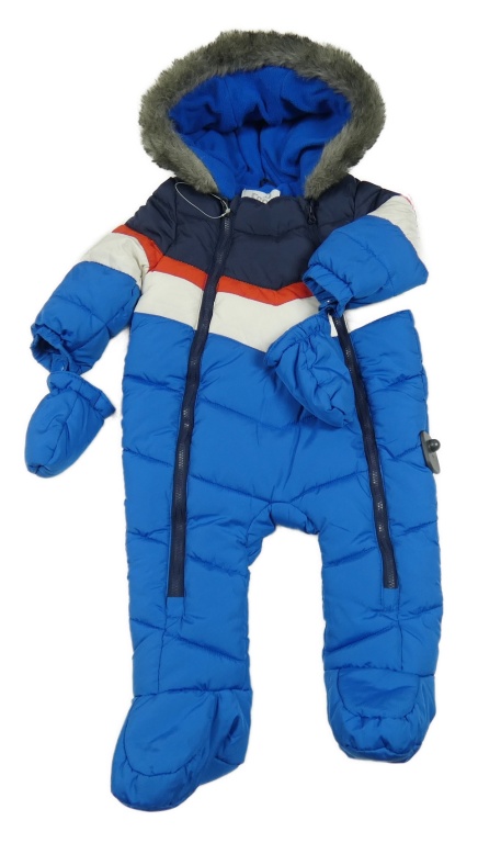 Tmavomodro-modro-červená šusťáková zimní kombinéza s kapucí + rukavice F&F