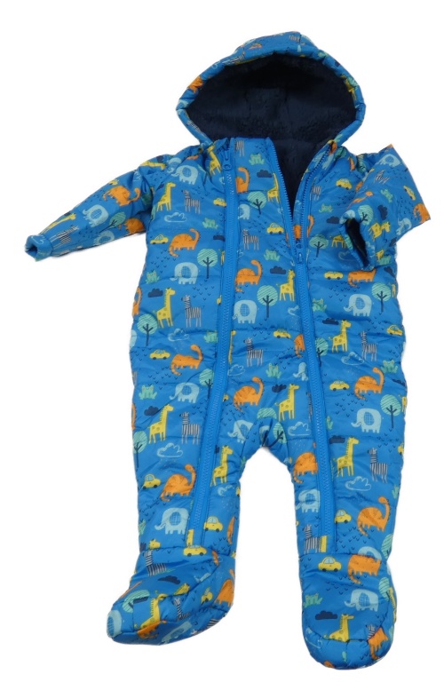 Modrá šusťáková prošívaná zimní kombinéza se zvířátky a kapucí St. Bernard