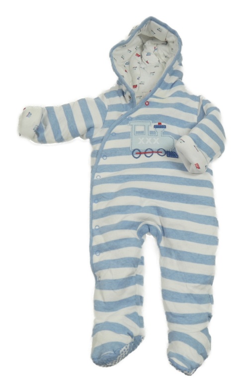 Modro-bílá pruhovaná zateplená kombinéza s vlakem a kapucí Miniclub