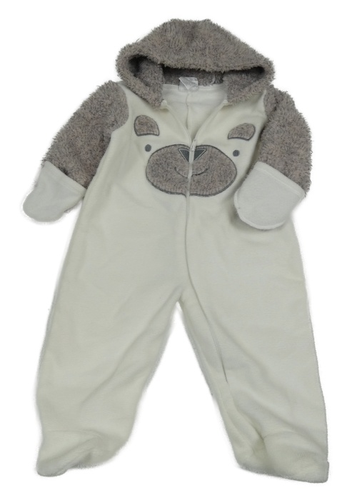 Bílo-šedá fleecovo/chlupatá kombinéza s medvídkem a kapucí