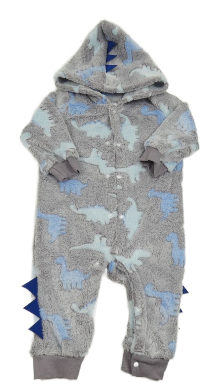 Šedá melírovaná chlupatá kombinéza s dinosaury a kapucí