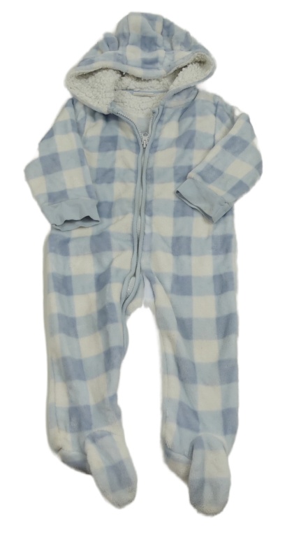 Světlemodro-bílá kostkovaná plyšová kombinéza s kapucí