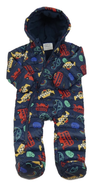 Tmavomodrá šusťáková zimní kombinéza s auty a kapucí F&F