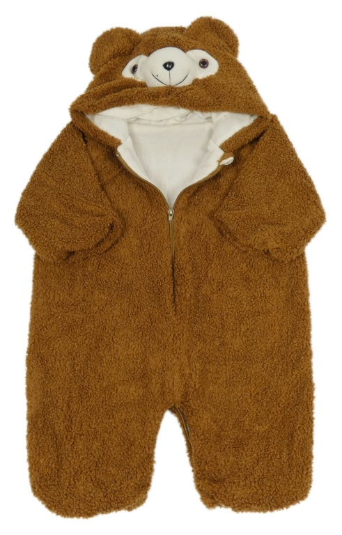 Hnědá huňatá podšitá kombinéza s kapucí s čumáčkem