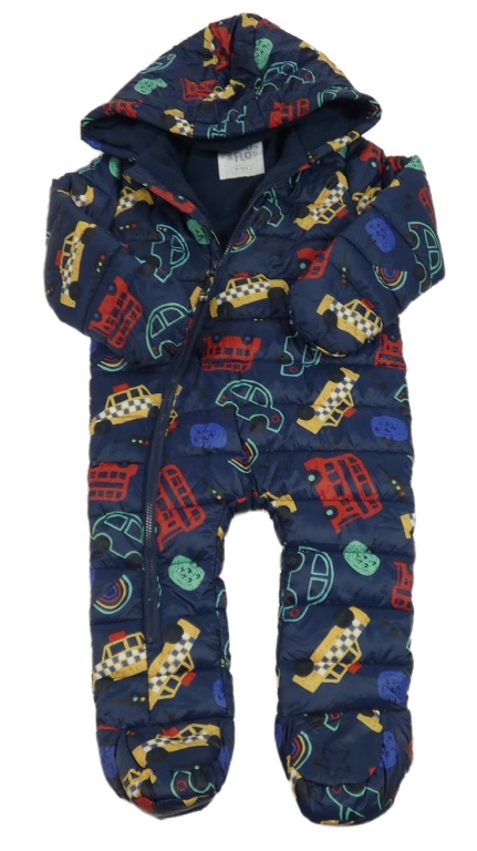Tmavomodrá šusťáková zimní kombinéza s auty a kapucí F&F