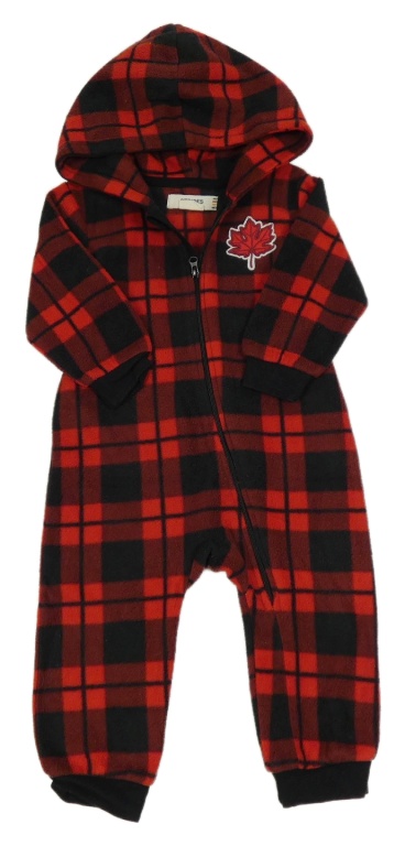 Červeno-černá kostkovaná fleecová kombinéza s javorovým listem a kapucí