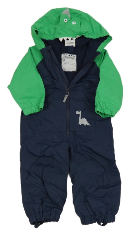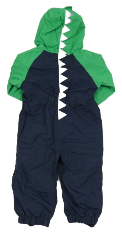 Tmavomodro-zelená šusťáková jarní kombinéza s dinosaurem a kapucí Topomini