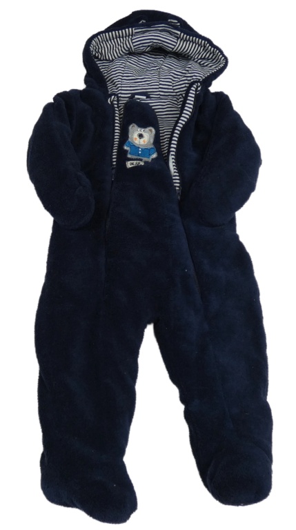 Tmavomodrá chlupatá zateplená kombinéza s medvědem a kapucí
