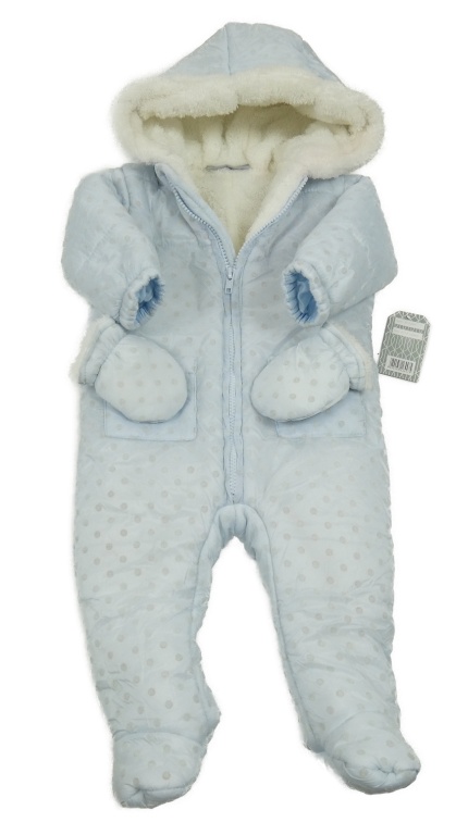 Nové - Světlemodro-bílá puntíkatá šusťáková zimní kombinéza s kapucí + rukavice