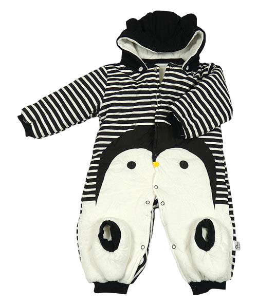 Černo-bílá pruhovaná zateplená kombinéza s tučňákem a kapucí