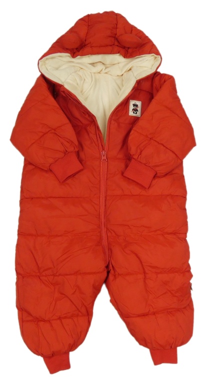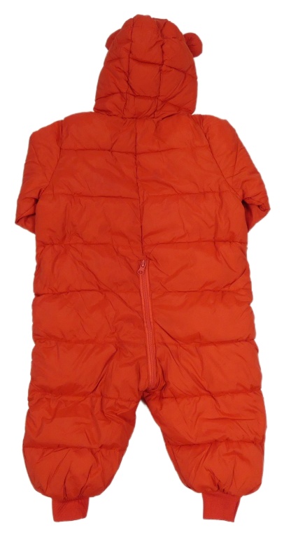 Červená šusťáková zimní kombinéza s medvědem a kapucí