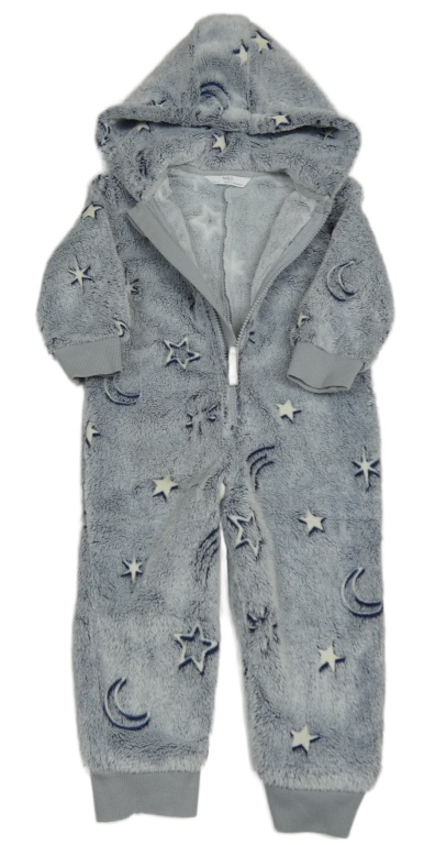 Tmavomodro-bílo-šedá plyšová kombinéza s hvězdičkami a měsíci a kapucí M&S