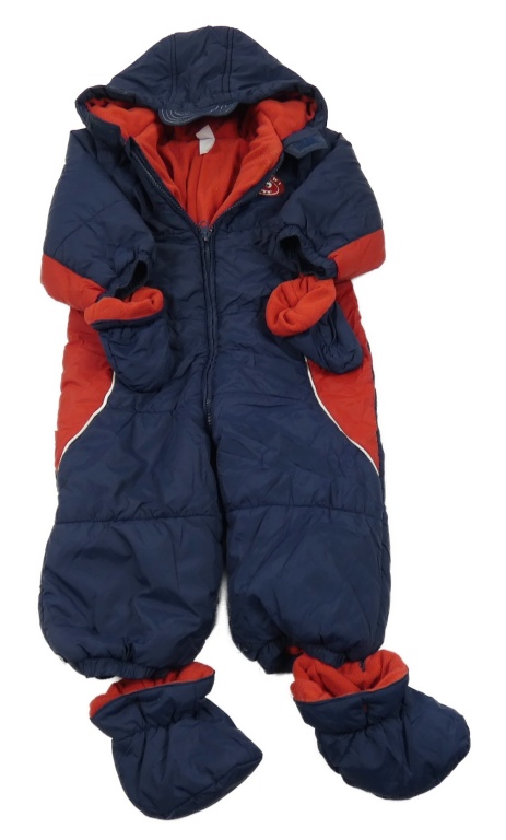 • Tmavomodro-červená šusťáková zimní kombinéza s nášivkou a kapucí + rukavice a capáčky C&A