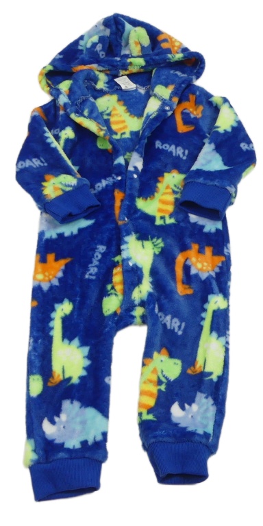 Modrá chlupatá kombinéza s dinosaury a kapucí