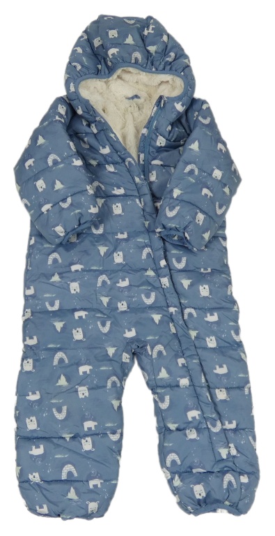 Modrá šusťáková prošívaná zimní kombinéza s medvídky a kapucí