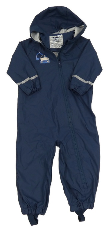 Tmavomodrá nepromokavá kombinéza s buldozerem a kapucí lupilu