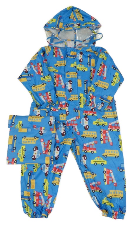 Modrá šusťáková nepromokavá kombinéza s IZS a autobusy a kapucí + sáček