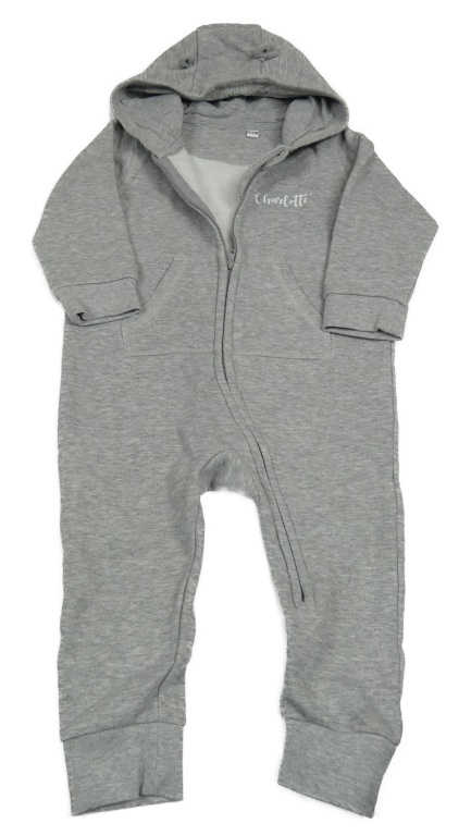Šedá tepláková kombinéza s nápisem a kapucí