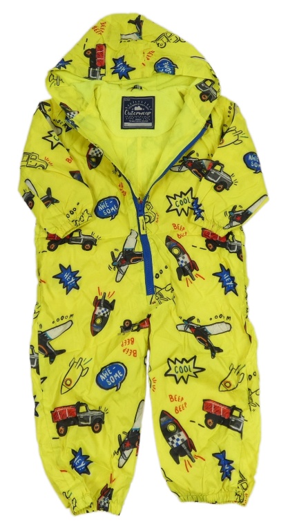 Neonově žlutá šusťáková podzimní kombinéza s auty a raketami a kapucí George