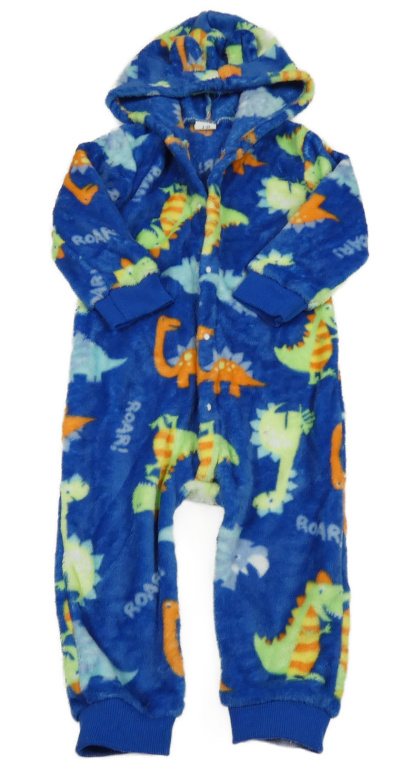 Modrá chlupatá kombinéza s dinosaury a kapucí