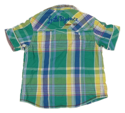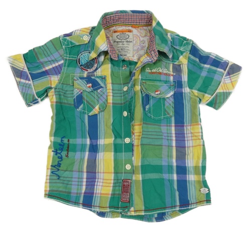 Zeleno-modro-žlutá kostkovaná košile s nápisy