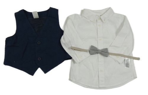 3set - Bílá košile + tmavomodrá vesta + šedý motýlek H&M
